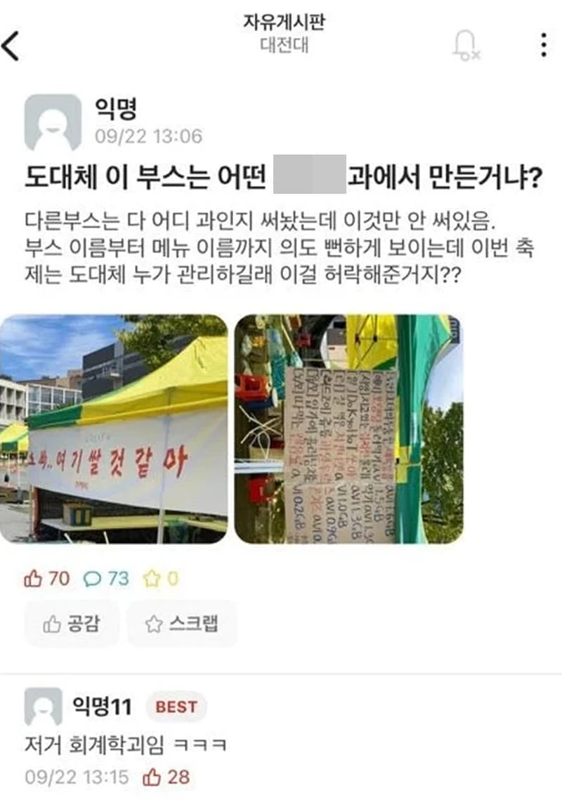 작성자는 “다른 부스는 다 어디 과인지 써 놨는데 이것만 안 쓰여 있다. 부스부터 메뉴 이름까지 의도 뻔하게 보이는데 이번 축제는 도대체 누가 관리하길래 이걸 허락해 준거냐”라고 사진과 함께 글을 올렸다.