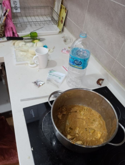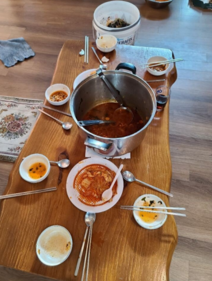 냄비에는 찌개가 남아있고, 먹다남은 피자와 비빔면 까지 그대로 남아있었다.