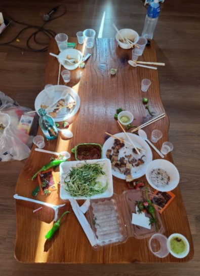 한 쪽에는 고기를 먹은 후 정리를 하지 않은 모습이 보였고, 바닥에 수북한 담배꽁초 또한 충격적인 모습이었다.