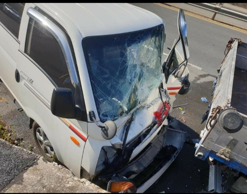 그의 옆에는 처참하게 부서진 트럭과 승용차의 모습이 보인다.