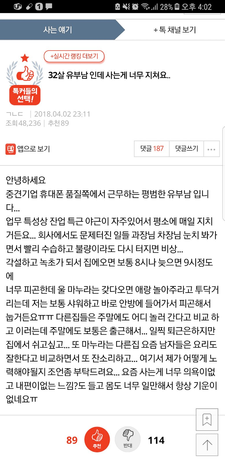 당시 32살 유부남이었던 글쓴이는 일이 너무 많아 아이와 놓아줄 시간이 없는 고충을 토로했다.