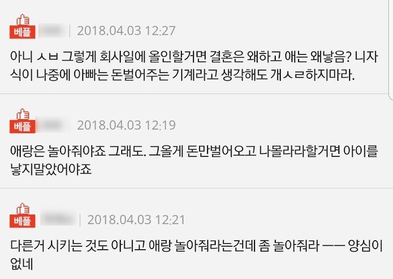 사람들은 “그렇게 회사 일에 올인할 거면 결혼은 왜 하고 애는 왜 낳냐? 니 자식이 나중에 아빠는 돈 벌어주는 기계라고 생각해고 개ㅈㄹ하지 말아라”라며 강한 비판을 가했다.