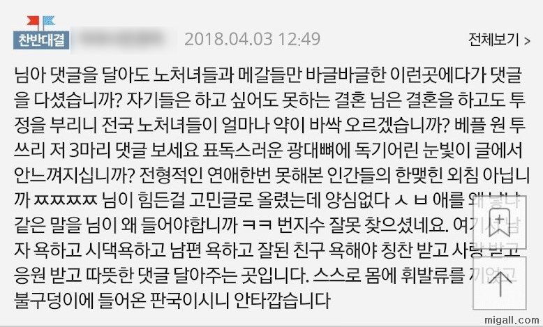 이어 “전형적인 연애 한번 못해본 인간들의 한맺힌 외침이다. 여긴 남자 욕하고 시댁 욕하고 잘된 친구 욕해야 서로 칭찬 받는 곳”이라며 사이트를 비판하기도 했다.