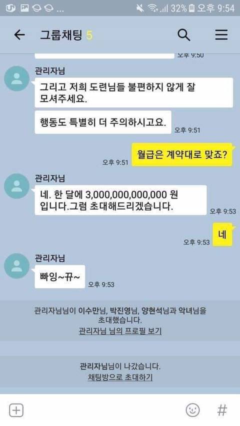 하지만 한 달을 버티면 무려 ‘3조’를 준다는 메신저 캡쳐 내용이 크게 화제를 모았다.