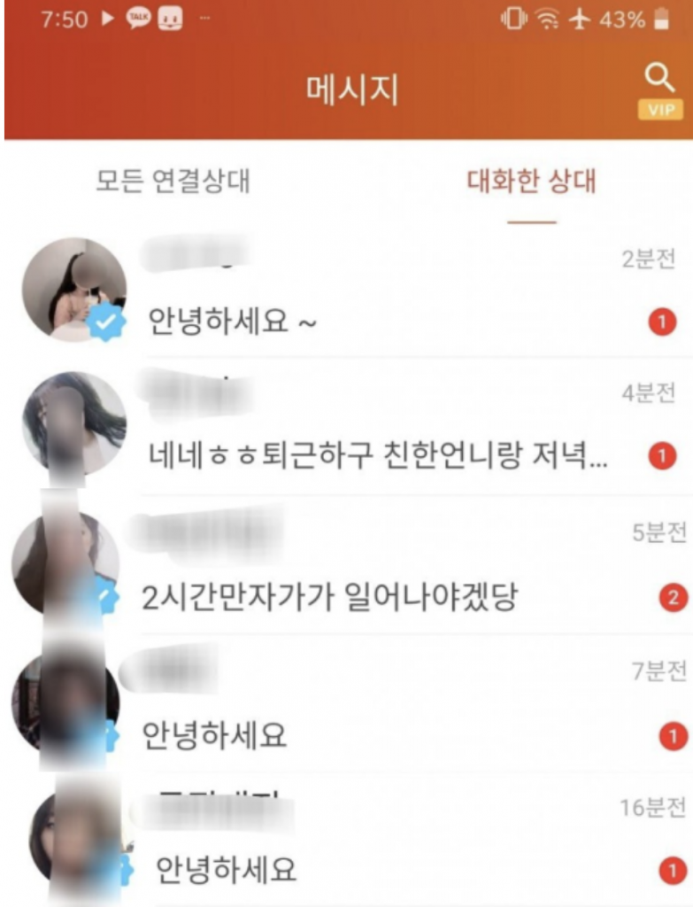 얼굴의 일부만 공개했고 한 유료어플 같아보이는 어플에서 딱봐도 수많은 여성들이랑 연락을 하는 것을 볼 수 있었다.