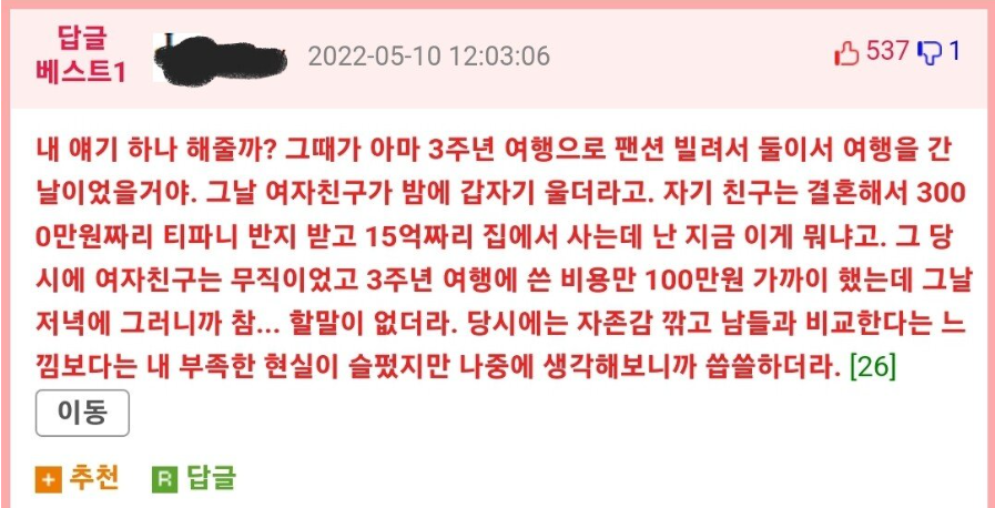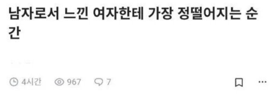 남자로서 느낀 여친에게 가장 정떨어지는 순간.jpg 한 국내 온라인 커뮤니티에 ‘남자가 여자에게 정 떨어지는 순간’이라는 제목의 게시글이 올라와 남성 네티즌들의 공감을 샀다. ADVERTISEMENT point 0 | point 50 | point 100 | point 150 | ADVERTISEMENT point 0 | point 50 | point 100 | 1 온라인 커뮤니티 ADVERTISEMENT 온라인 커뮤니티 ADVERTISEMENT point 0 | 온라인 커뮤니티 point 57 | 온라인 커뮤니티 point 114 | ADVERTISEMENT point 0 | 온라인 커뮤니티 point 57 | 온라인 커뮤니티 point 114 | ADVERTISEMENT point 0 | 온라인 커뮤니티 point 57 | 온라인 커뮤니티 point 114 | ADVERTISEMENT point 0 | 온라인 커뮤니티 point 57 | 온라인 커뮤니티 point 114 | ADVERTISEMENT point 0 | 온라인 커뮤니티 point 57 | 온라인 커뮤니티 point 114 | ADVERTISEMENT point 0 | 온라인 커뮤니티 point 57 | 온라인 커뮤니티 point 114 | ADVERTISEMENT point 0 | 온라인 커뮤니티 point 57 | 온라인 커뮤니티 point 114 | ADVERTISEMENT point 0 | 온라인 커뮤니티 point 57 | 온라인 커뮤니티 point 114 | ADVERTISEMENT point 0 | 온라인 커뮤니티 point 57 | 온라인 커뮤니티 point 114 | ADVERTISEMENT point 0 | 온라인 커뮤니티 point 63 | 1 네티즌들은 남자로서 여친에게 가장 정 떨어지는 순간을 크게 “다른 사람과 나를 비교하는 사람”, “자존감을 깎아먹는 사람”을 공통적으로 언급했다. ADVERTISEMENT [저작권자 NEWSNACK/ 무단복사, 무단전재 및 재배포 금지 (위반 시 법적조치)]