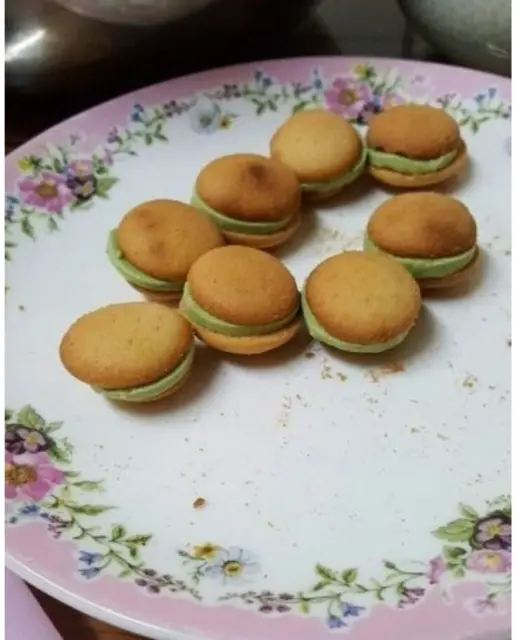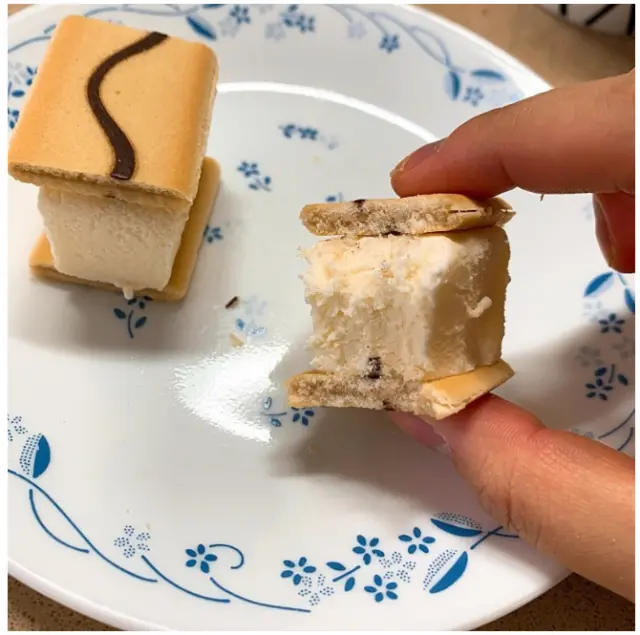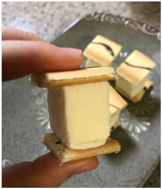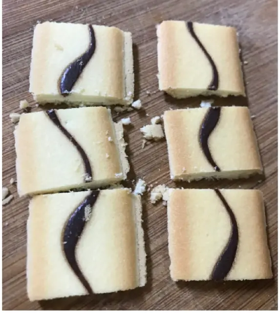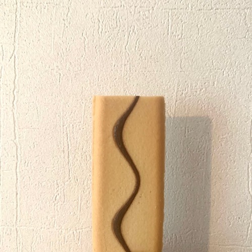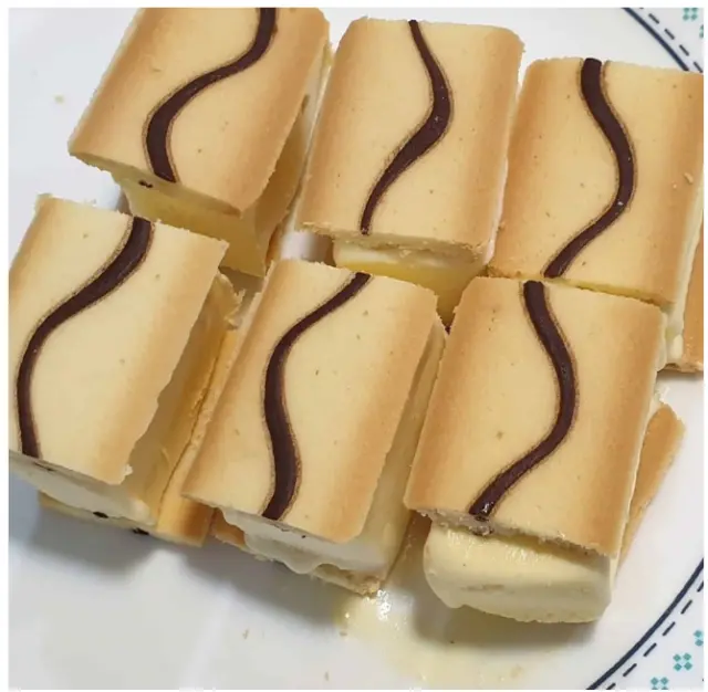 하얀 쿠키위에 물결무늬의 초콜릿이 그려져 있는 납작한 직사각형 과자
