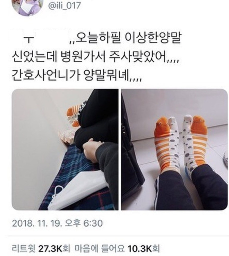 트위터 이용자 A씨는 “오늘 하필 이상한 양말 신었는데 병원가서 주사 맞았다. 간호사 언니가 양말 뭐냐고 했다”고 전했다.