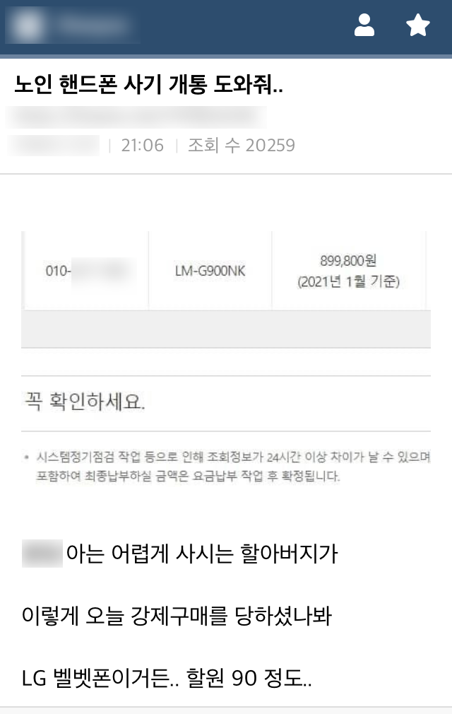 게시글 작성자 A씨는 “어렵게 사시는 할아버지가 오늘 강제구매를 당하셨다. LG 벨벳폰을 할부원금 90만원 정도에 사셨다”고 전했다.