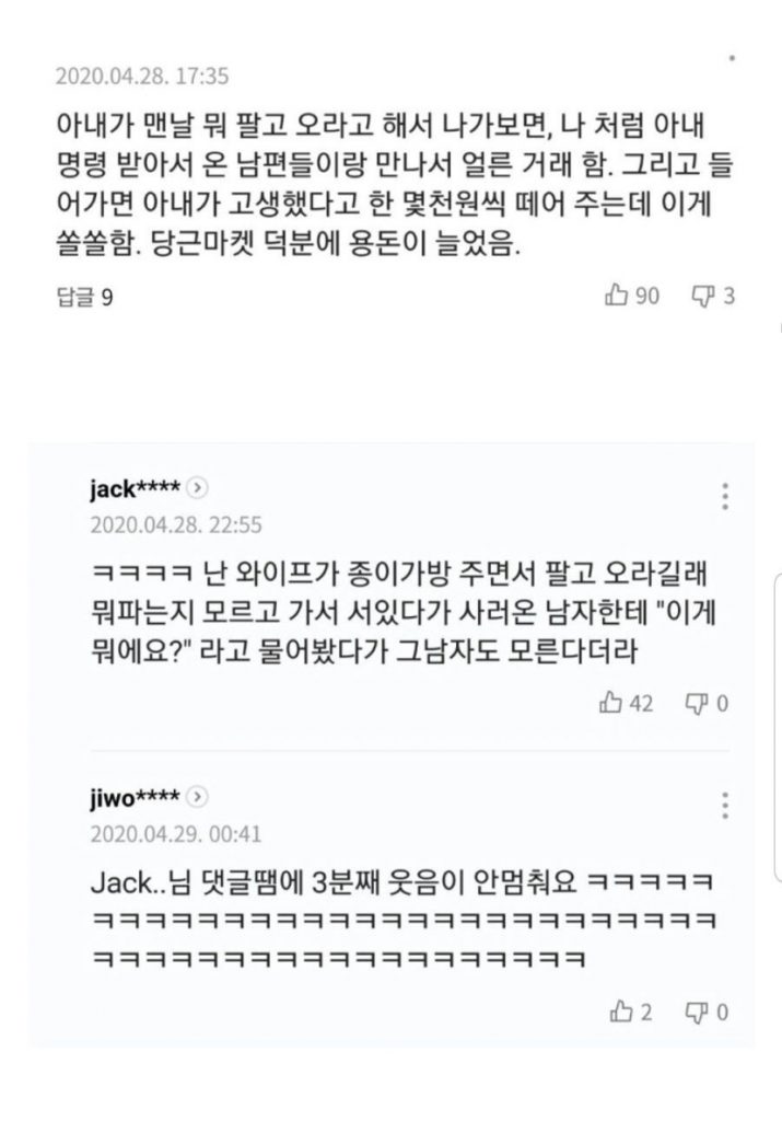 또 다른 누리꾼은 “난 와이프가 종이 가방 주면서 팔고 오라길래 뭐 파는지 모르고 가서 서 있다가 사러 온 남자한테 “이게 뭐예요?” 라고 물어봤다가 그 남자도 모른다더라”고 전해 보는 이들에게 웃음을 전했다.