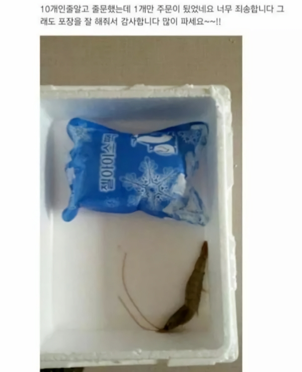 소식을 확인한 누리꾼들은 “새우 한마리가 먼길 오느라 고생했네”, “아이스팩 시켰는데 새우를 주는 곳이 있다?” 등의 반응을 보였다.