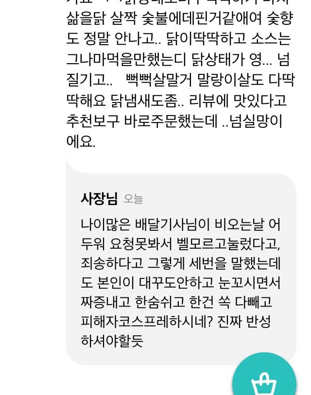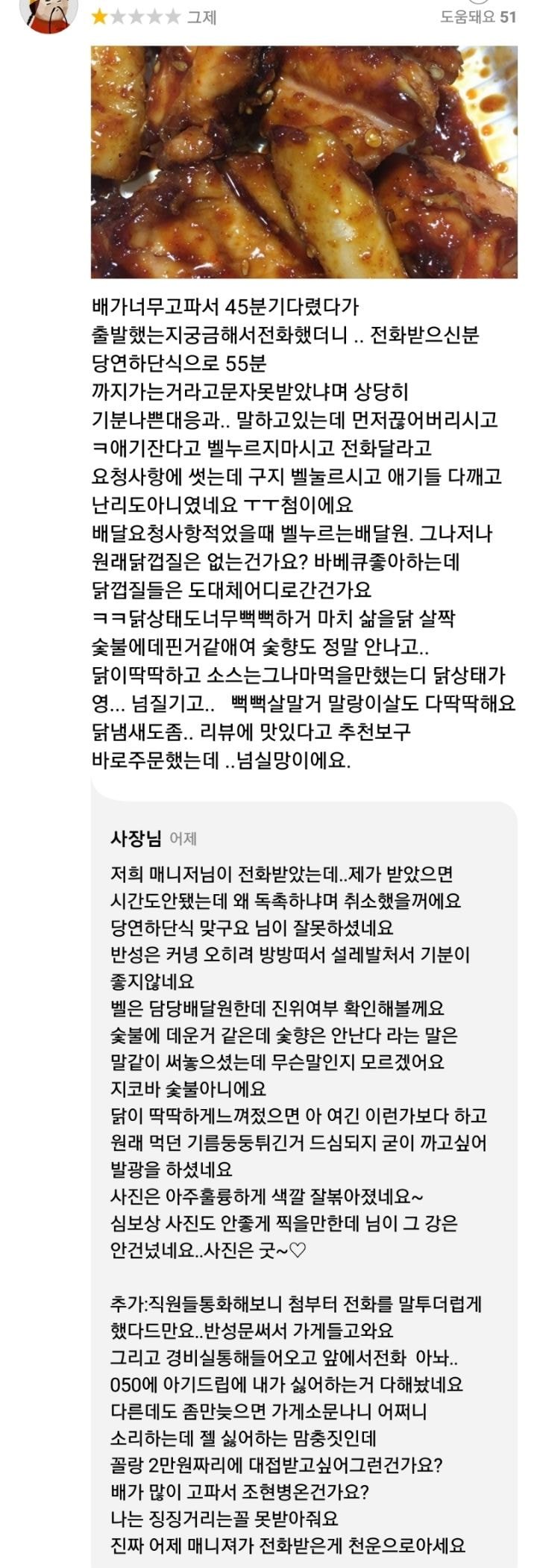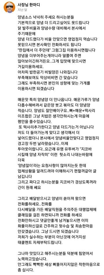 사장은 ” 배달 받으시고 양념이 쏟아져 나왔으면 전화를 하라. 댓글 안 좋게 남겨놓으면 이미 화풀이 하신 걸로 간주하고 뒷수습 및 죄송한 마음 안 갖는다”며 “안그래도 빡빡한 세상 삐뚤어지지 않은 마음으로 살자”고 전했다.