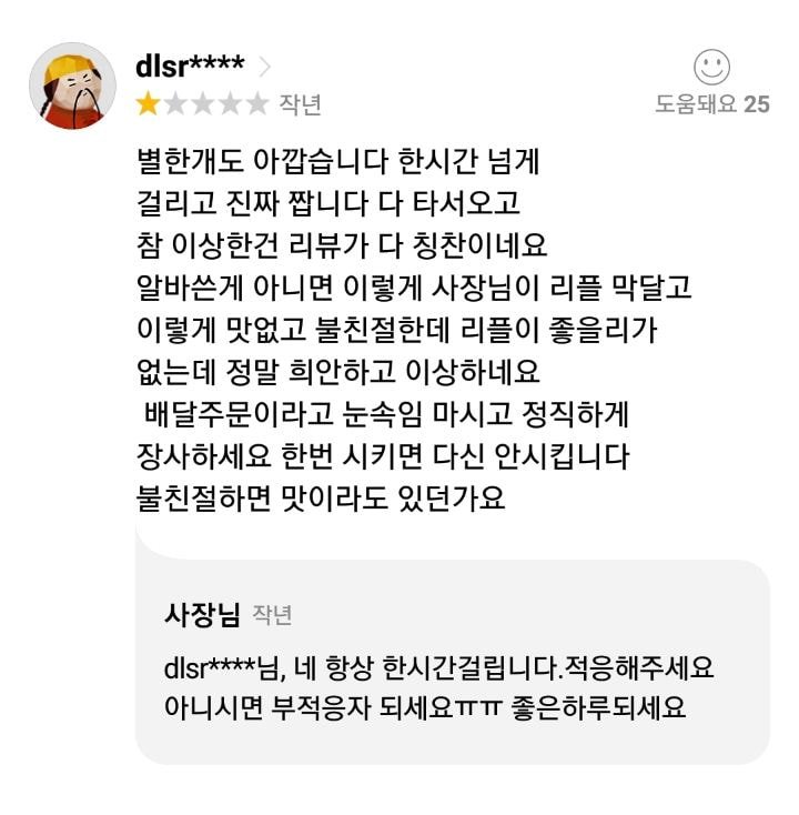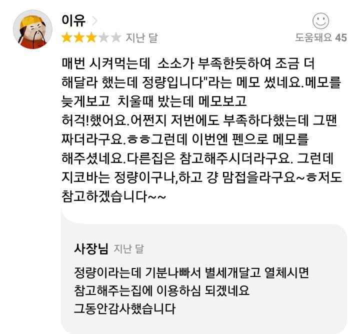 또한 다른 손님에게는 “정량이라는데 기분 나빠서 별 세 개 달고 열체시면 참고해주는 집에 이용하심 되겠네요”라고 지적했다.
