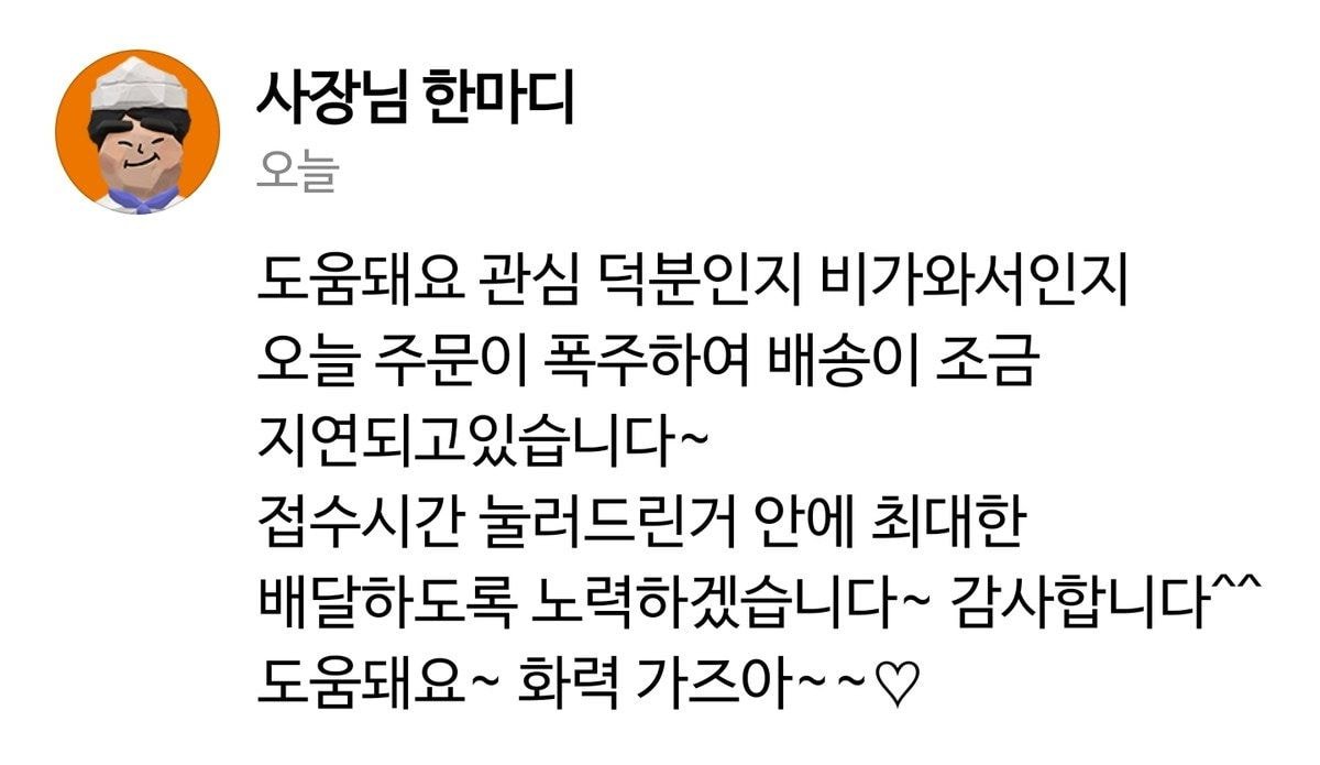 사장은 “도움돼요 관심 덕분인지 비가와서인지 주문이 폭주했다”며 “화력 가즈아~”라고 속마을 남기기도 했다.
