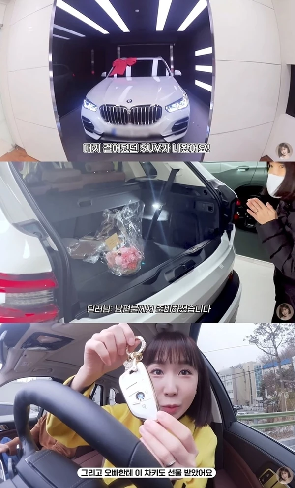 해당 영상에서 초아는 남편과 삼성동에 있는 한 외제차 전시장을 찾았고, 이때 리본을 단 새 차가 급 등장했다.