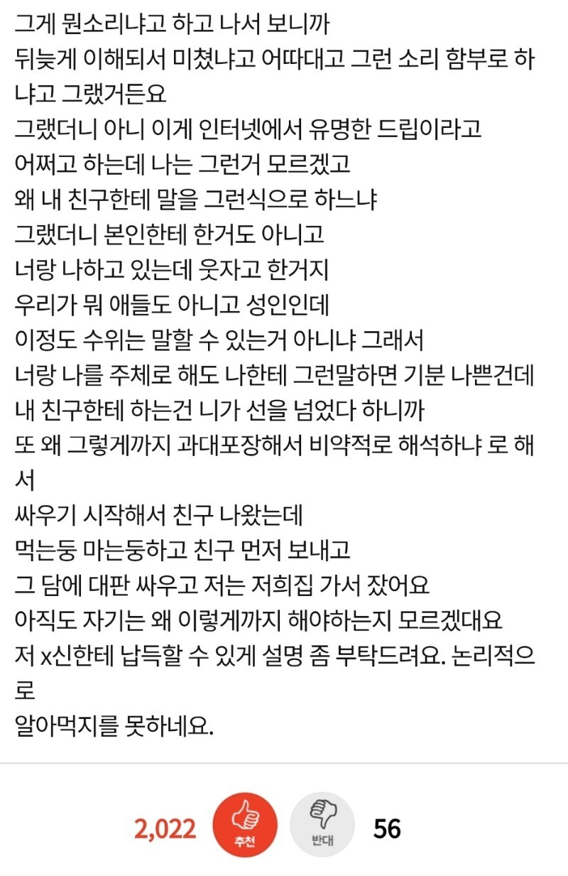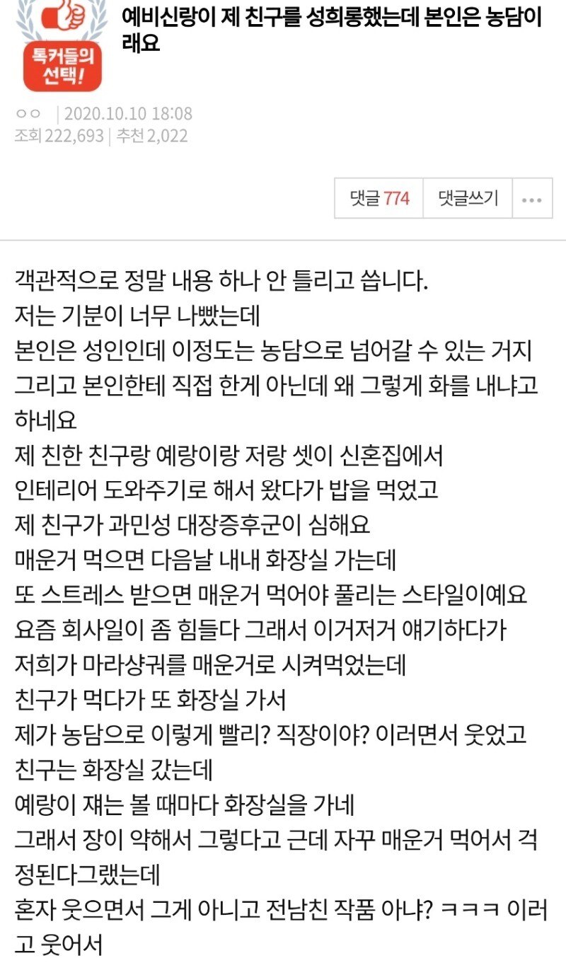 처음에 A씨는 무슨 말인지 이해가 되지 않았지만 곧 19금 드립이라는 사실을 깨달았다.