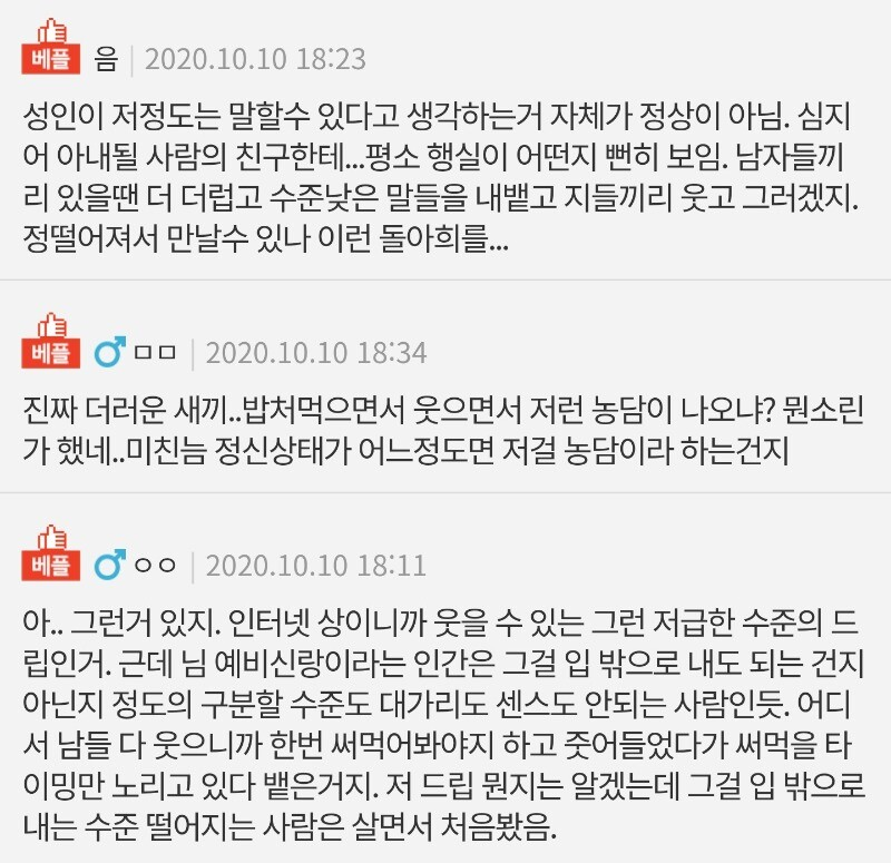 소식을 확인한 누리꾼들은 “성인이 저 정도는 말할 수 있다고 생각하는 거 자체가 정상이 아니다. 심지어 아내될 사람 친구인데”, “인터넷이니까 웃을 수 있지. 근데 현실에서는 선 넘었지”, “저런 X도 여자를 사귀고 결혼까지 생각하네” 등의 반응을 보였다.
