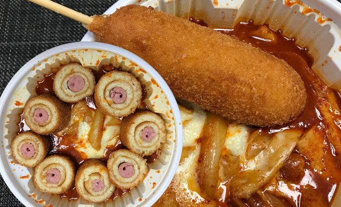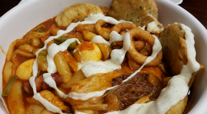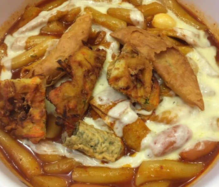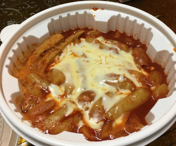 떡볶이에 치즈와 비엔나 소시지가 들어간다.
