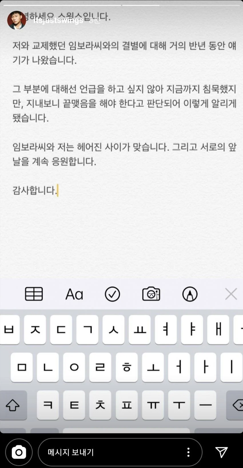 21일 스윙스는 자신의 인스타그램에 “저와 교제했던 임보라씨와의 결별에 대해 거의 반년 동안 얘기가 나왔다”고 서두를 열었다.
