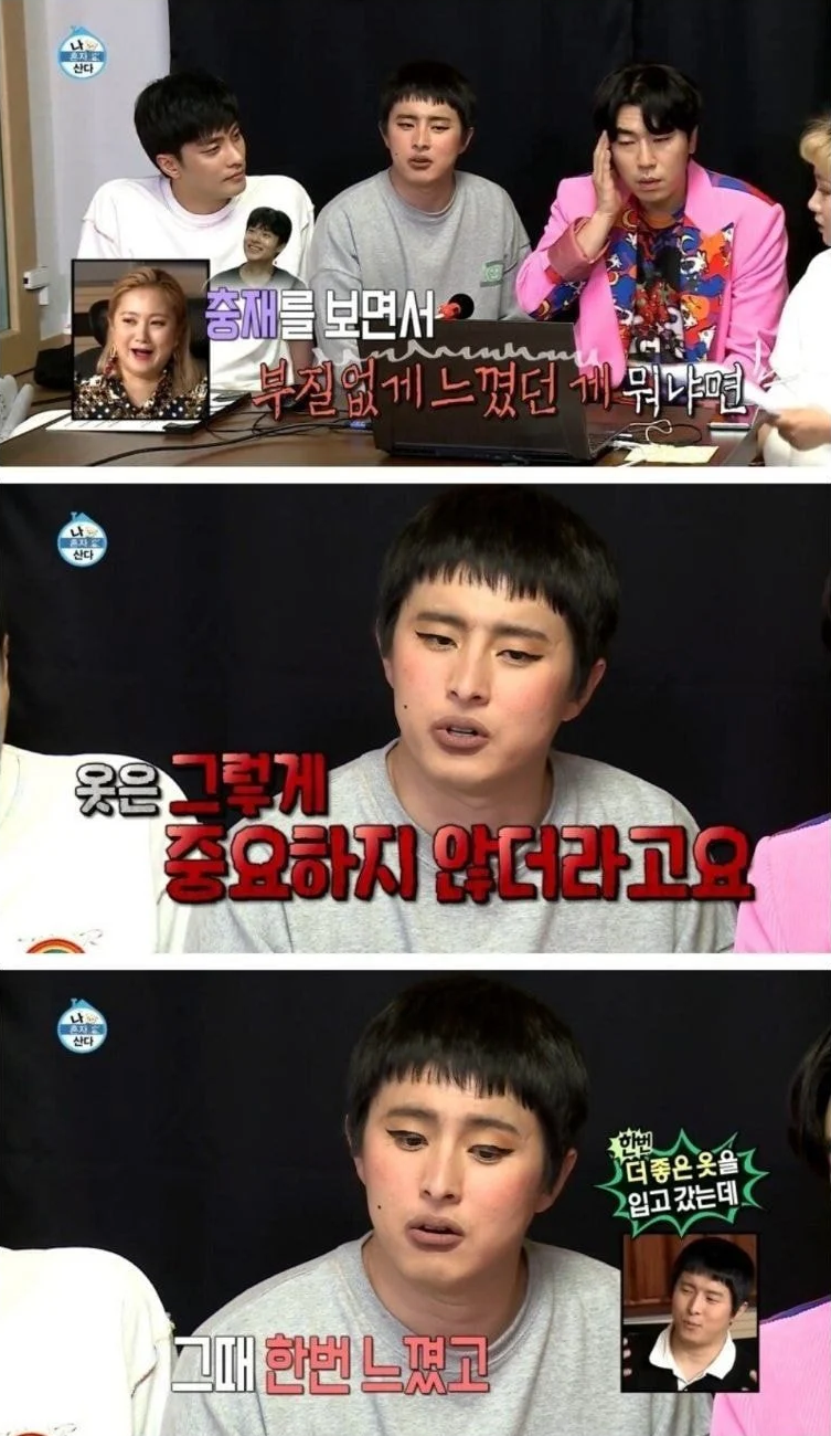 이어 그는 “(그런데) 충재를 보면서 부질없게 느꼈던 게 뭐냐면 옷은 그렇게 중요하지 않더라”며 “한 번은 내가 더 좋은 옷을 입고 가고 충재는 청바지에 티 하나 걸쳤는데 너무 멋있더라. 자괴감이 들었다”고 솔직하게 털어놨다.