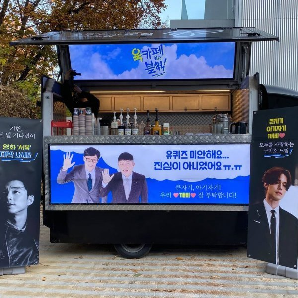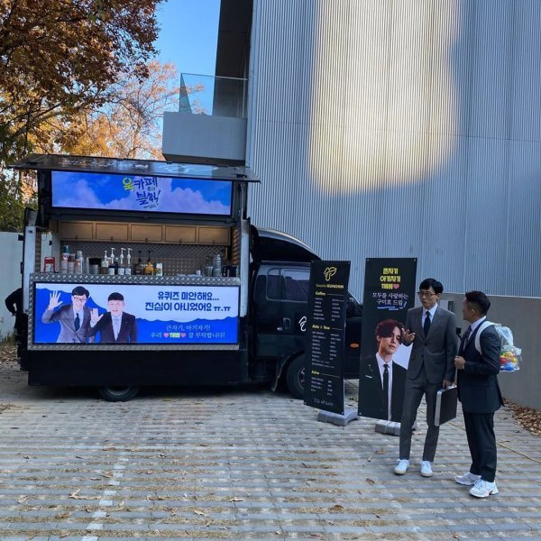이동욱은 커피차에 ‘유퀴즈 미안해요. 진심이 아니었어요’라는 문구를 덧붙였다.
