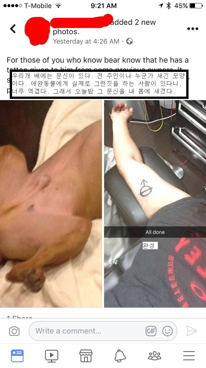 글쓴이는 말 못하는 개에게 문신을 한 전주인에게 분노하며 이 문신을 자신의 몸에도 새기기로 결심하고 똑같은 문신을 새겼다.