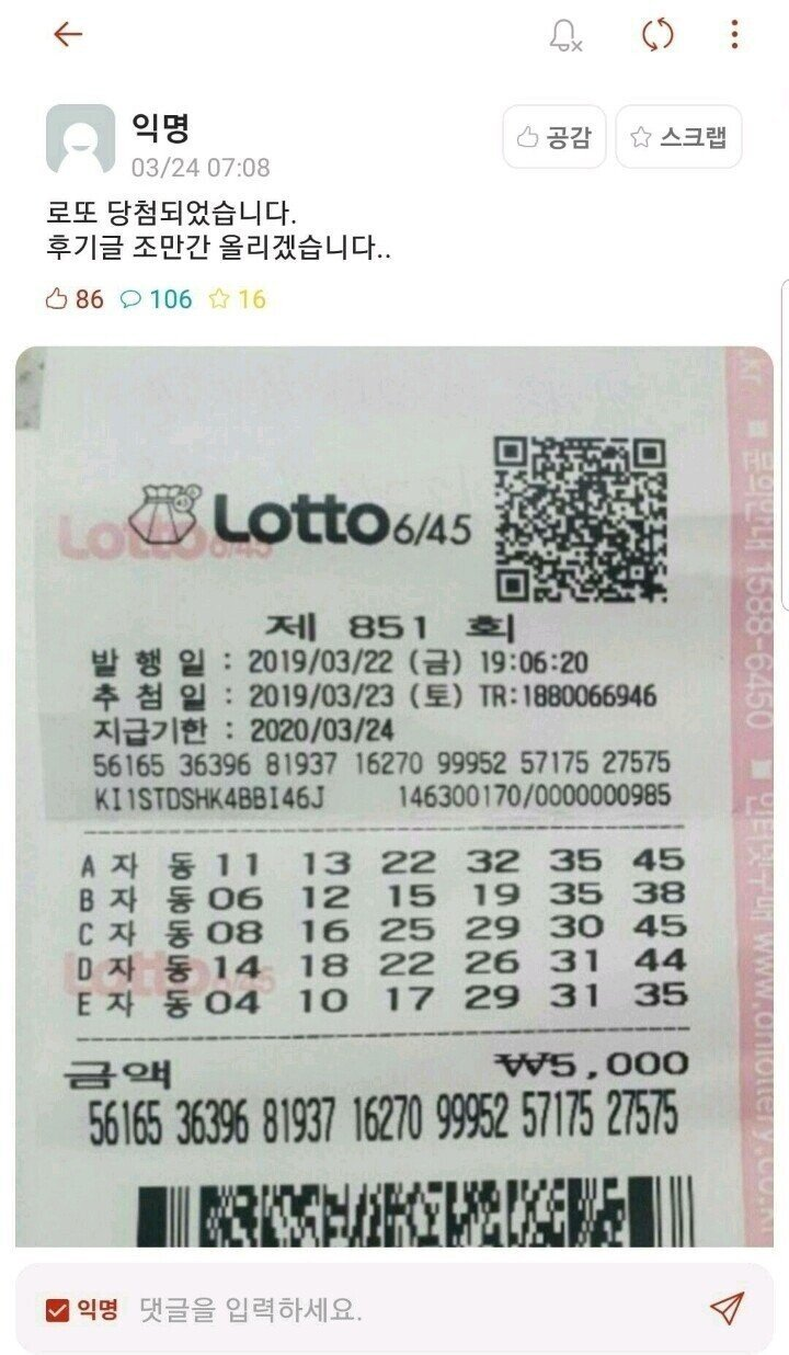 A씨는 “그래도 5천원을 투자하여 자동번호를 돌렸는데 1등에 당첨됐다. 서울에 중소형 아파트 하나 구매하고 외제차 산 다음 일상으로 돌아가려 한다”고 계획을 전했다.