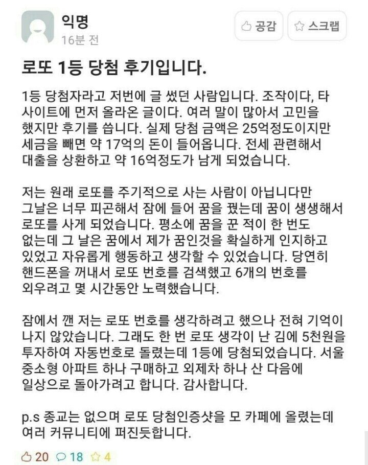 8일 한 온라인 커뮤니티엔 ‘로또 1등 당첨 인증했던 고려대생’이란 제목의 글이 인기를 끌었다.