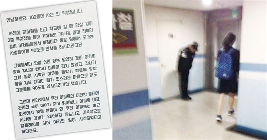 이어 “얼마 전부터 경비 아저씨들께서 아침마다 통로 앞에서 오가는 사람들에게 90도로 인사를 한다”며 “그분들보다 한참 어린 저는 당연히 경비 아저씨 앞을 지나갈 때마다 마음이 편치않았고 죄스러운 마음이 들어 저도 90도로 인사를 드렸다”고 전했다.