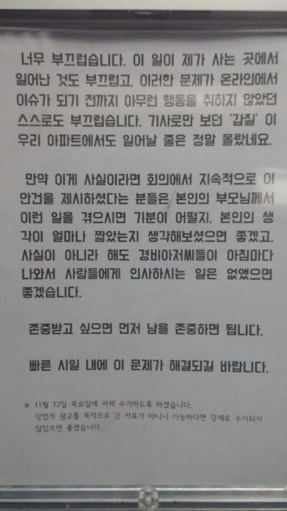 그리고 그는 “너무 부끄럽습니다. 이 일이 제가 사는 곳에서 일어난 것도 부끄럽고, 이러한 문제가 온라인에서 이슈가 되기 전까지 아무런 행동을 취하지 않았던 스스로도 부끄럽습니다”라며 “기사로만 보던 ‘갑질’이 우리 아파트에서도 일어날 줄은 정말 몰랐네요”라며 해당 아파트에 살고 있다는 것에 부끄러움을 느낀다고 전했다.