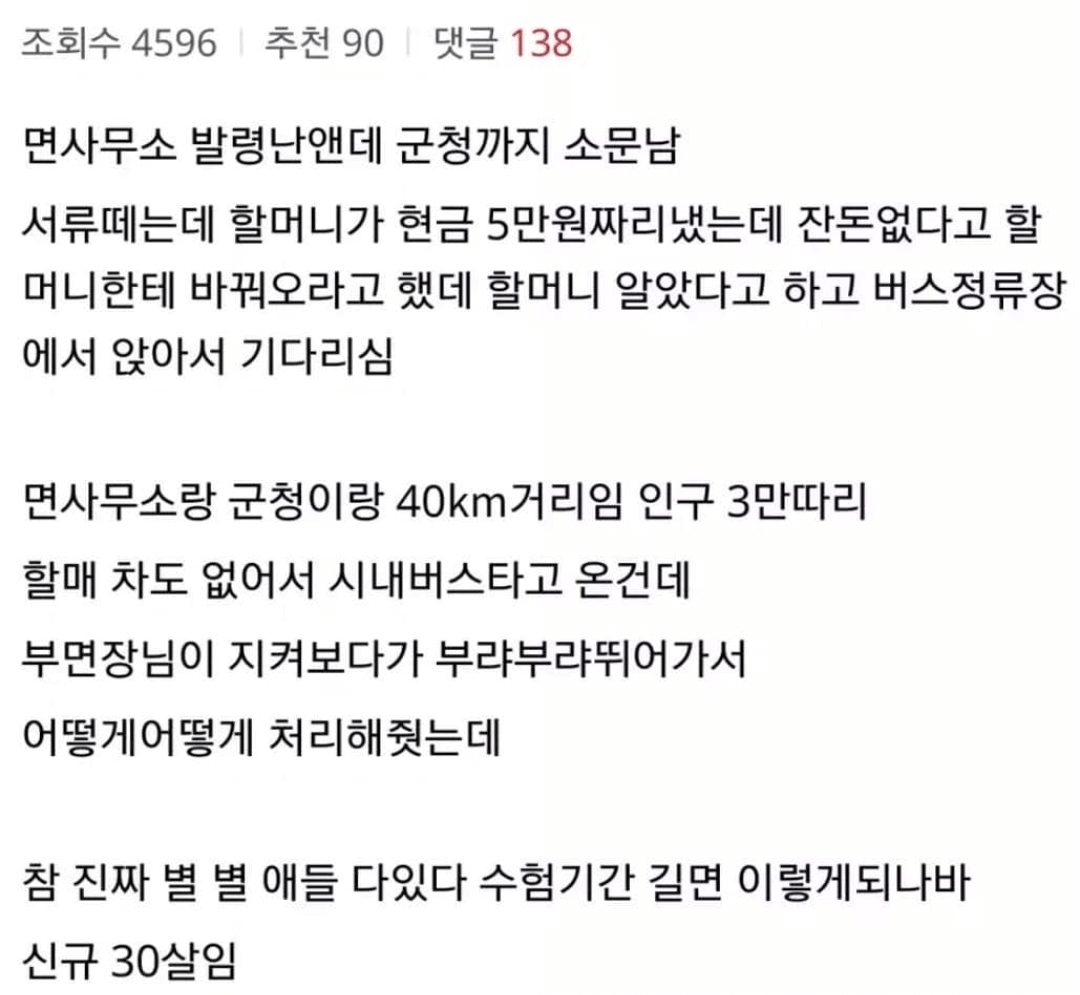 다행히도 이를 지켜보던 부면장님이 부랴부랴 뛰어가 할머니를 모시고 와 서류 발급은 무사히 마쳤다고 한다.