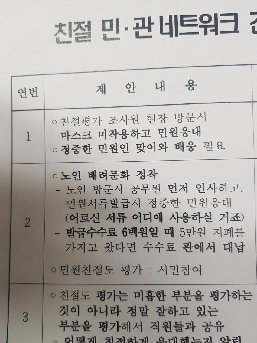 구체적으로는 “노인 방문시 공무원이 먼저 인사하고, 민원서류발급시 정중한 민원응대”, “발급수수료 6백원일 때 5만원 지폐를 가지고 왔다면 수수료 관에서 대납” 등이 적혀 있었다.