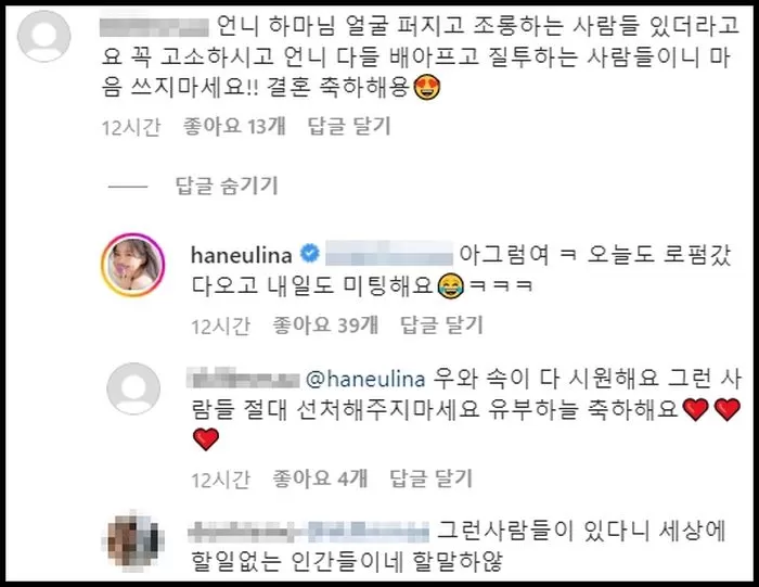 팬은 “꼭 고소하시고 언니 다들 배 아프고 질투하는 사람들이니 마음 쓰지 마세요. 결혼 축하해요”라고 덧붙였다.