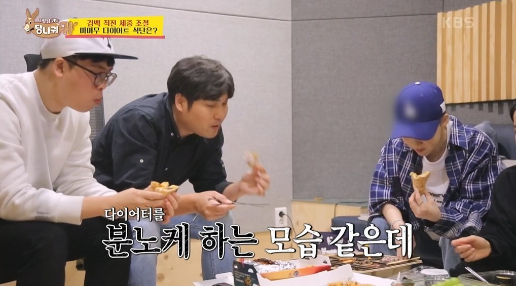반면 먹어도 살이 찌지 않는 문별은 작곡가들과 피자, 치킨 등 고칼로리 음식을 옆에서 섭취했다.