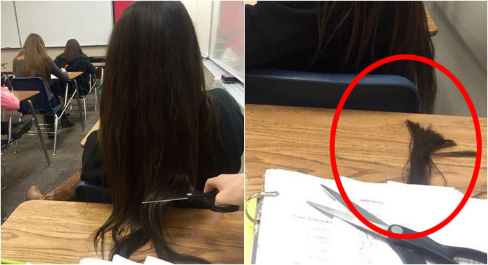 바로 앞자리에는 긴 머리의 여학생이 앉아있는데 자세히 보니 여학생의 긴 머리에 ‘가위’가 보인다.