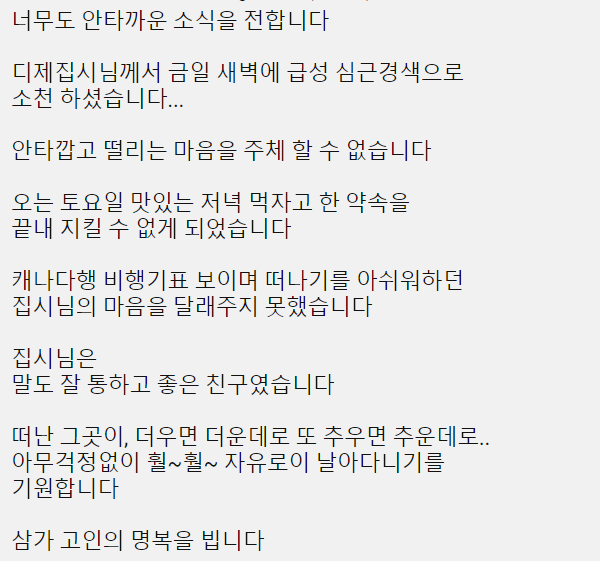 그는 “안타깝고 떨리는 마음을 주체 할 수 없습니다. 오는 토요일 맛있는 저녁 먹자고 한 약속을 끝내 지킬 수 없게 되었습니다”라고 전했다.