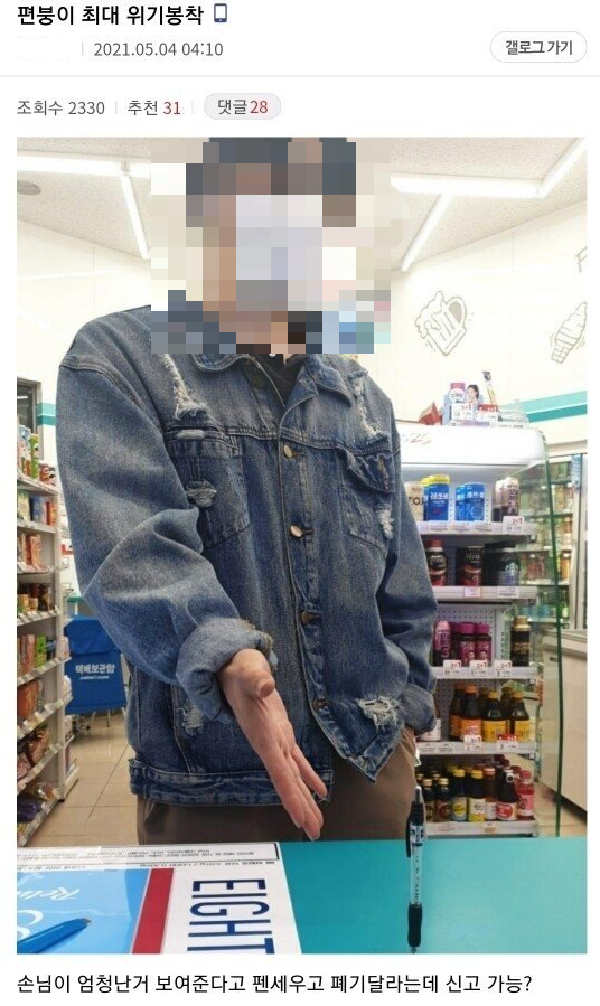 작성자 A씨는 “최대 위기 봉착. 손님이 엄청난 거 보여준다고 펜 세우고 폐기 달라는데 신고 가능하냐”고 도움을 구했다. 그는 계산대 앞에 서서 직접 펜을 세우는 손님의 사진을 찍어 올렸다. 실제 사진 속 손님은 한 손으로 펜을 가리키고 있는 모습이다.
