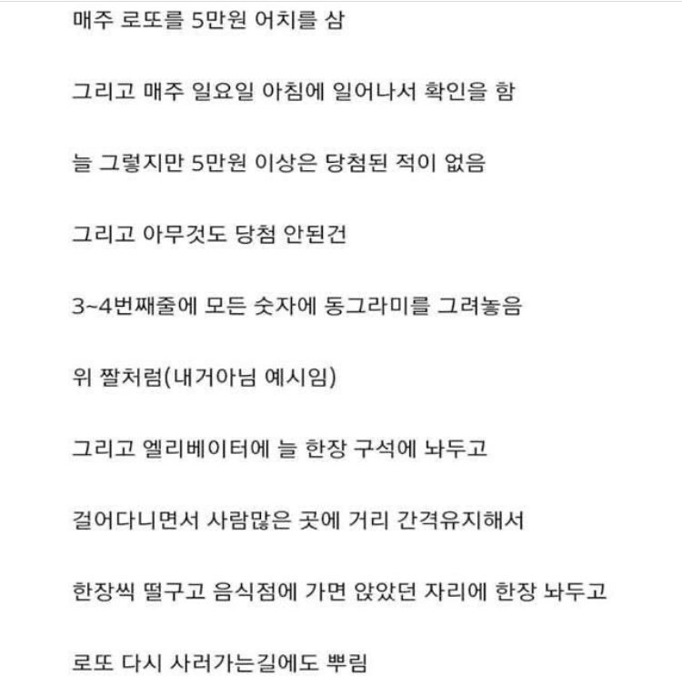 최근 온라인 커뮤니티에 ‘매주 5만 원 어치 로또 사는 사람의 악랄함’이라는 제목의 글이 올라와 눈길을 끌고 있다.