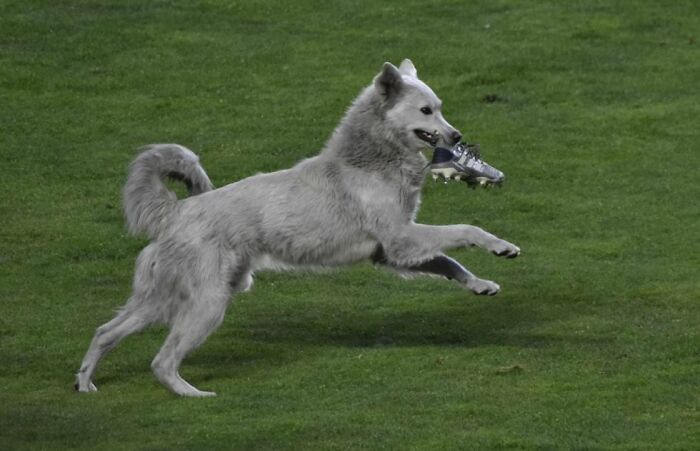 그라운드에 떠돌이 개 한 마리가 축구화를 입에 문 채로 뛰어든 것이다.