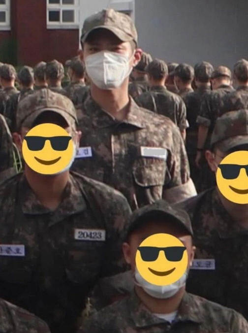 카메라를 보며 살짝 미소짓고 있는 박보검의 사진은 같은 분대 훈련병들과 함께 찍은 단체 사진 일부로 보인다.