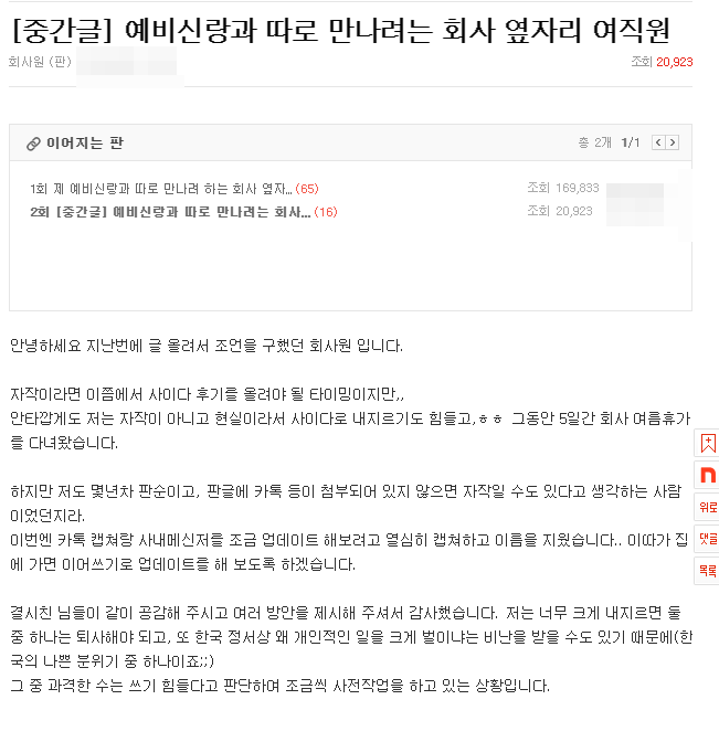 우선 직장 동료일 뿐이고 큰 관심이 없었기에 그래 그래~ 이러고 한 귀로 듣고 한 귀로 흘렸습니다.