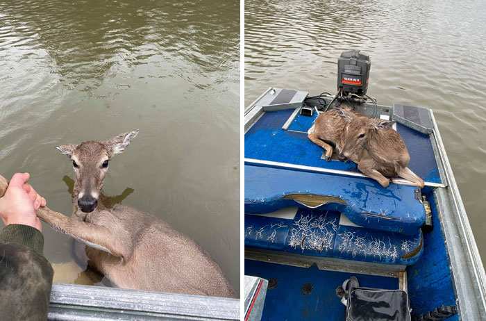 #9 내 사촌이 강으로 낚시를 갔다가 사슴을 구했어요. 너무 지쳐서 물에 가라앉는 중이었대요