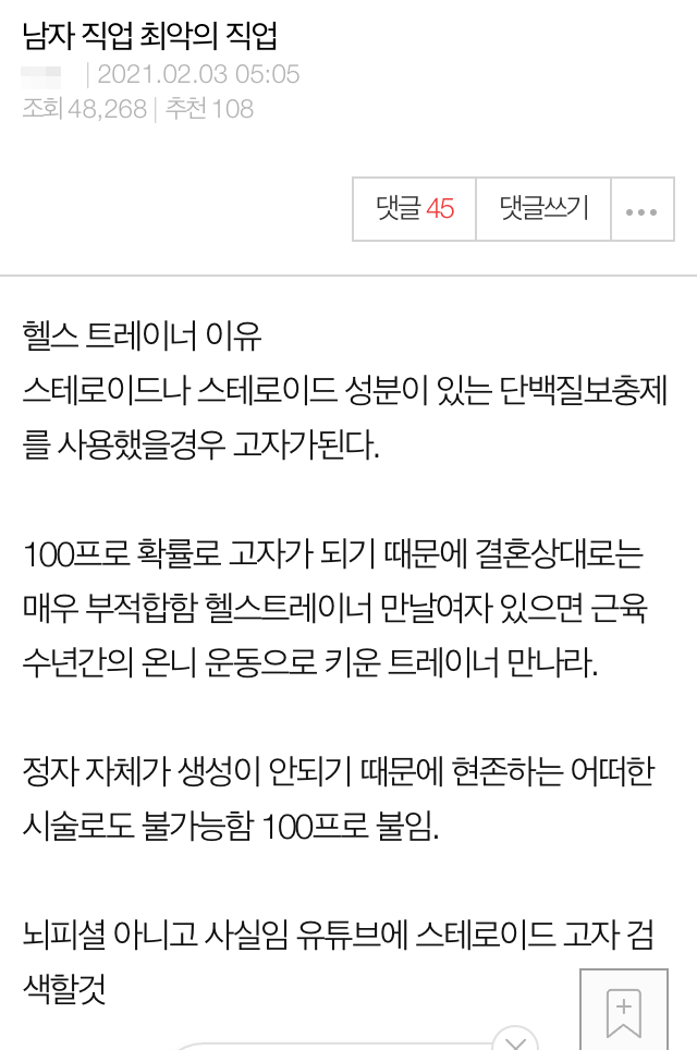 게시글 작성자 A씨는 “헬스 트레이너다. 스테로이드를 사용했을 경우 고ㅈr가 된다. 결혼 상대로 매우 부적합하다”고 꼬집었다.
