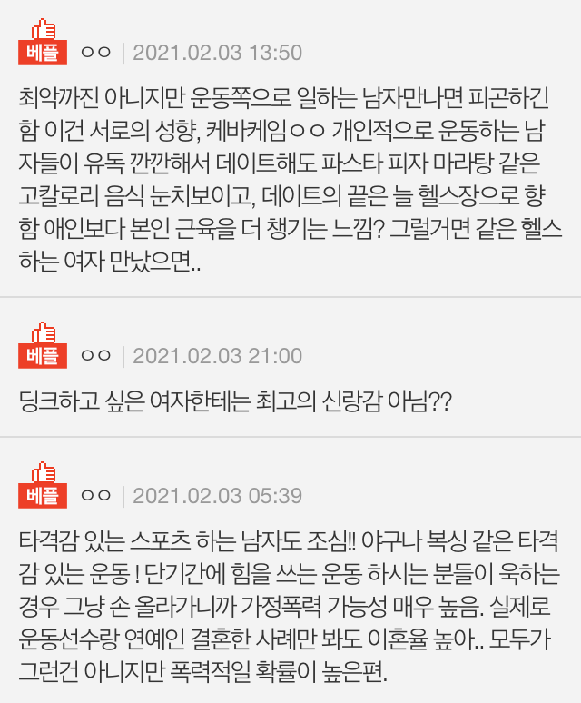 반면 “헬스트레이너 말고 일반 헬창이면 남편감으로 나쁘지 않다. 근손실 올까봐 술자리도 잘 안간다”, “운동으로 스트레스 푸는 정도가 딱 적당하다” 등의 의견도 있었다.
