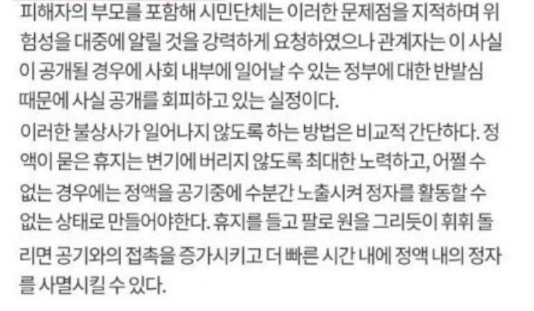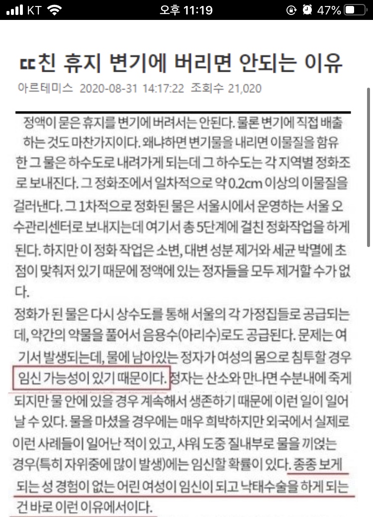 해당 게시물에 따르면 정.액이 묻은 휴지를 변기에 버리면 안된다. 변기에 직접 배출하는 것도 마찬가지다.
