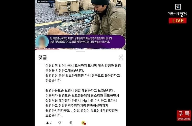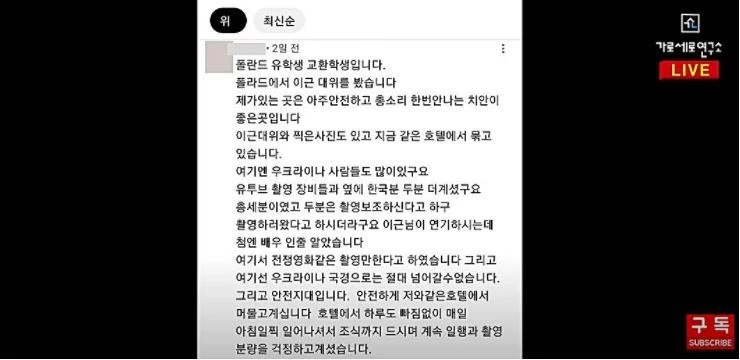 한편, 지난 22일 시사 유튜브 채널 ‘가로세로연구소'(이하 가세연)는 “이근 전 대위가 현재 우크라이나가 아니라 폴란드에 있는 한 호텔에서 전쟁 영화 같은 영상을 찍고있다”고 주장했다.