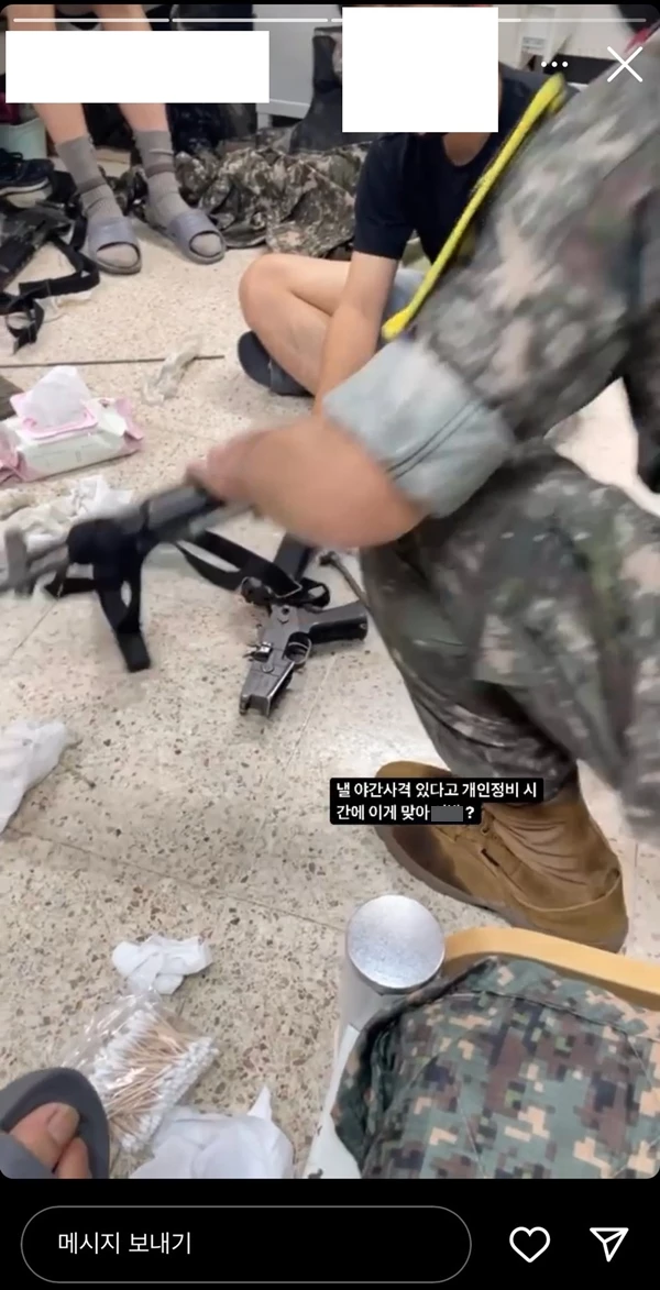 해당 글에는 일과시간을 끝낸 한 육군 병사가 SNS에 올린 사진 한 장이 올라왔는데, 해당 병사는 부대 내에서 총기 손질 중인 장면을 인증하며 “내일 야간사격 있다고 개인정비 시간에 이게 맞아 XX?”이라고 분노의 글을 적었다.