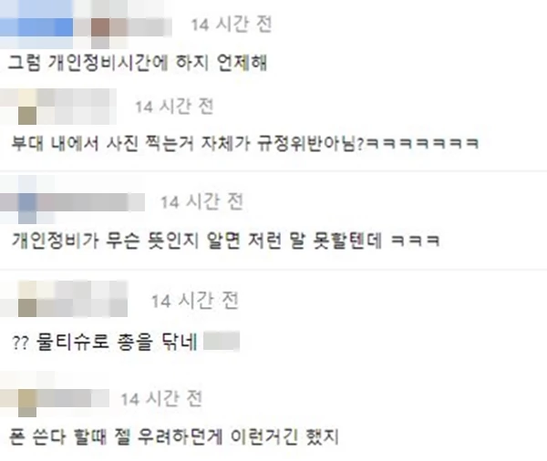 이를 본 네티즌들은 “개인정비는 개인화기 손질, 전투장구류 손질 등 전시에 즉각 출동을 위해 개인이 해야 하는 정비 활동”이라며 글을 작성한 병사를 지적했다.