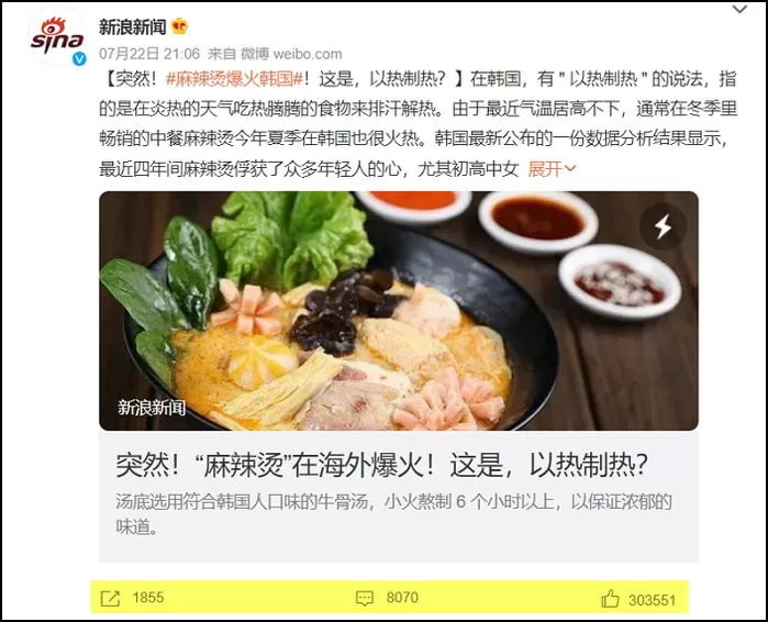 해당 보도는 중국 커뮤니티 웨이보 등을 통해 빠르게 퍼져나가 CCTV 보도를 공유한 웨이보 게시물에 공감은 30만개, 댓글은 8천 개가 달렸으며 ‘마라탕에 빠진 한국’이라는 키워드가 실시간 검색어 상위권에 오르기도 했다.