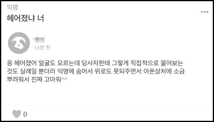 이에 “응 헤어졌어. 얼굴도 모르는데 당사자한테 그렇게 직접적으로 물어보는 것도 실례일뿐더러, 익명에 숨어서 위로도 못 되면서 아픈 상처에 소금 뿌려줘서 고마워”라고 답하기도 했다.
